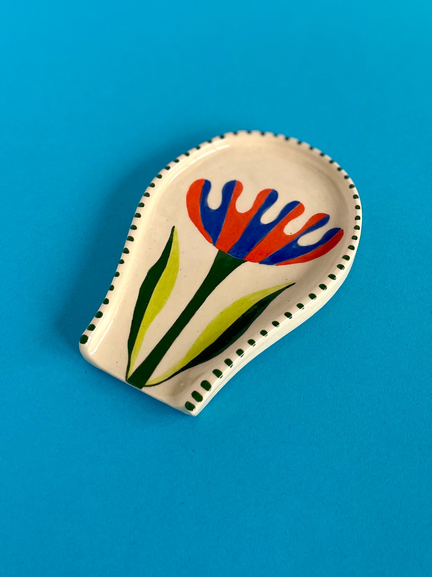Handmade using a slab and coil in white stoneware clay, the flower is hand painted with underglaze, finished with a glossy transparent glaze.